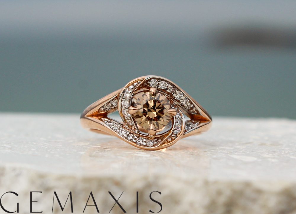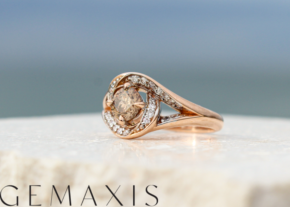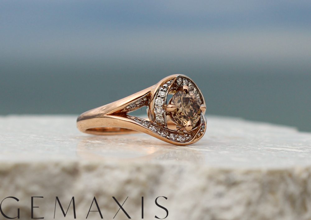 A quality high-end 18k Rose Gold Argyle Champagne Diamond Wave Ring with those signature Gemaxis curves and unbelievable clean finish. This baroque inspired ring design is elegant and sophisticated. The .71ct Argyle Champagne Diamond is surrounded by an alternative Halo of natural White Diamonds, which gives it that edge and rich look.