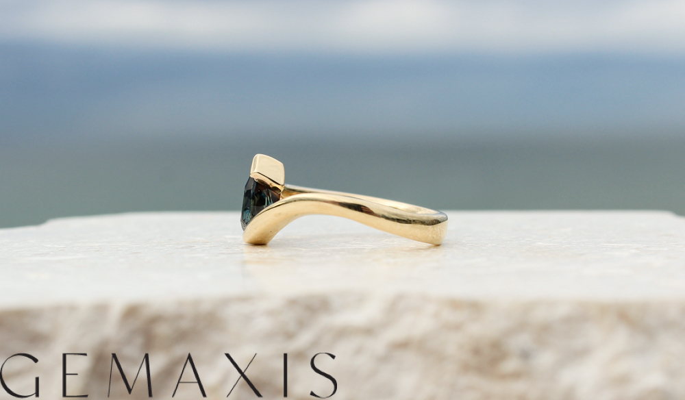 The yellow gold bezel set design gives this ring its class and timeless flair. In the centre is a lab-grown 1 carat pear shaped Teal Sapphire ‘floating’ between the ‘ocean-inspired’ curved design. This unique ring is handmade by Gemaxis Jewellery in Ocean Grove and can be customised where required.